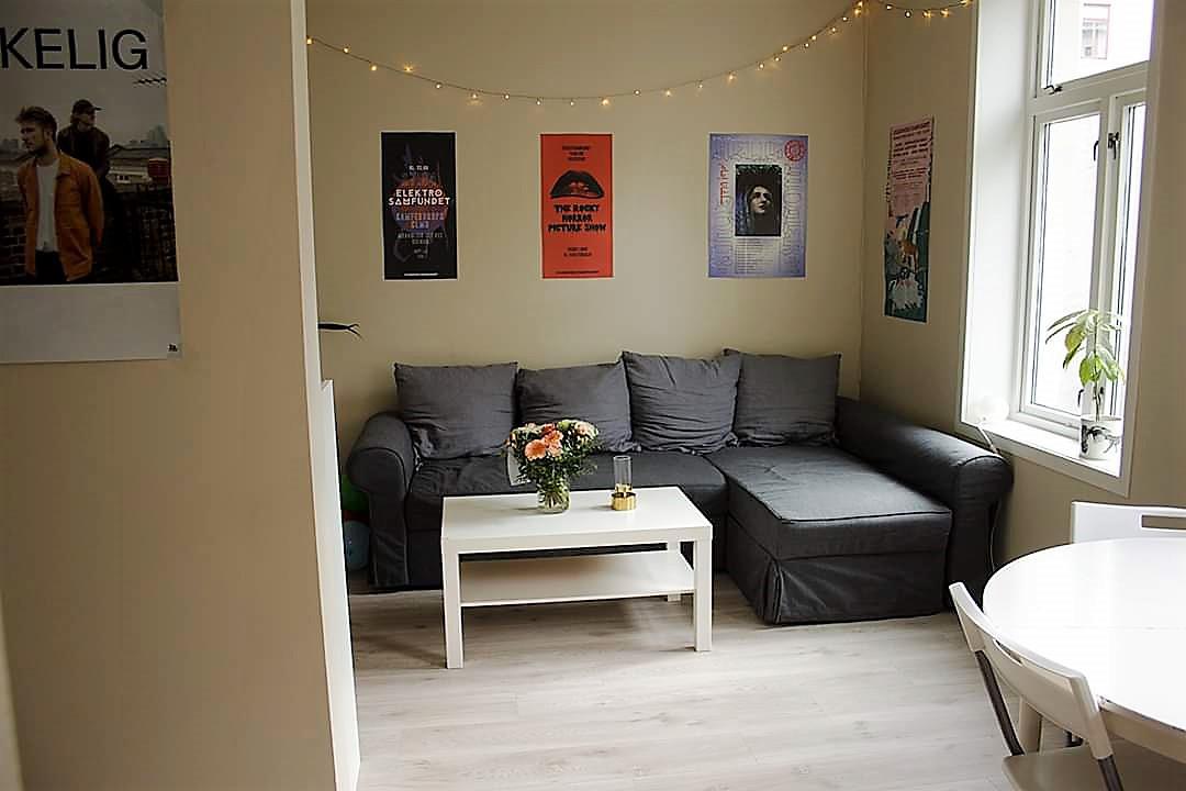 Leiligheten har felles stue, kjøkken og bad samt inngangsparti for å kunne henge fra seg yttertøy. Fellesarealer er møblert og hvitevarer på kjøkkenet følger med.