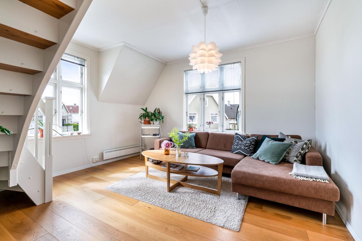 Leiligheten går over 2 plan henholdsvis 2. og 3. etasje. Den oppleves derfor som lys og luftig med store vinduer som sikrer masse naturlig lys. Gjennomgående god standard med 4 store soverom, kjøkken, stue, gang og 2 nyoppussede bad med toalett og dusj. Stuen er romslig og inneholder sofa, tv-bord og salongbord. Pent kjøkken med integrerte hvitevarer i form av platetopp, oppvaskmaskin og stekeovn.