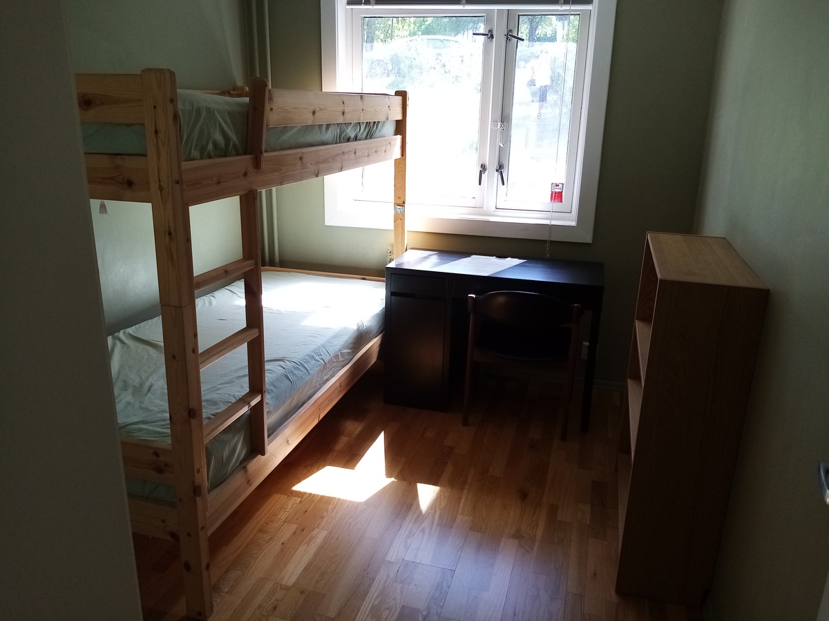 Rommet er i underkant av ni kvadratmeter, har parkett på gulvet, skrivebord, klesskap, TV-skjerm, hylle og 90 cm. seng (Hemnes fra IKEA). Køyesengen på bildene er borte.