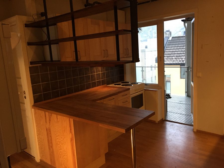 Lys og hyggelig treroms leilighet med stor stue og to soverom (et stort og et lite) til leie. Fint beliggende i rolig gatetun, like ved BI, UiB, park og strand.