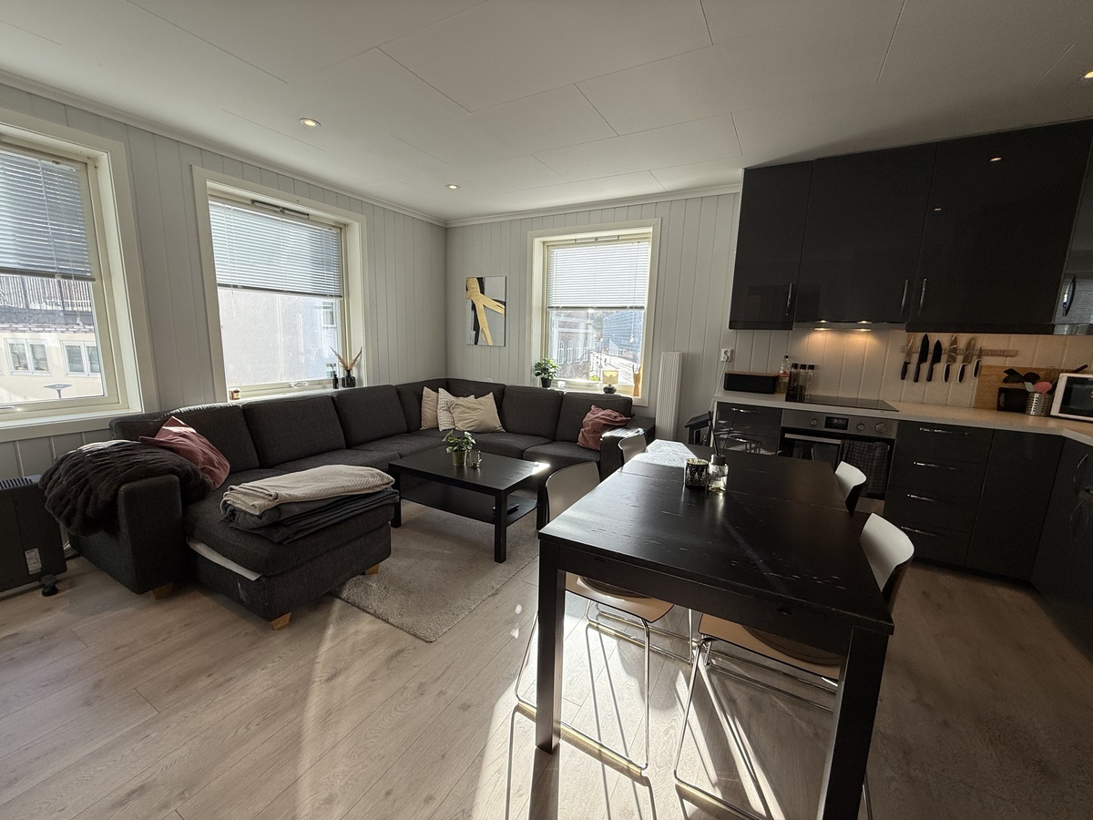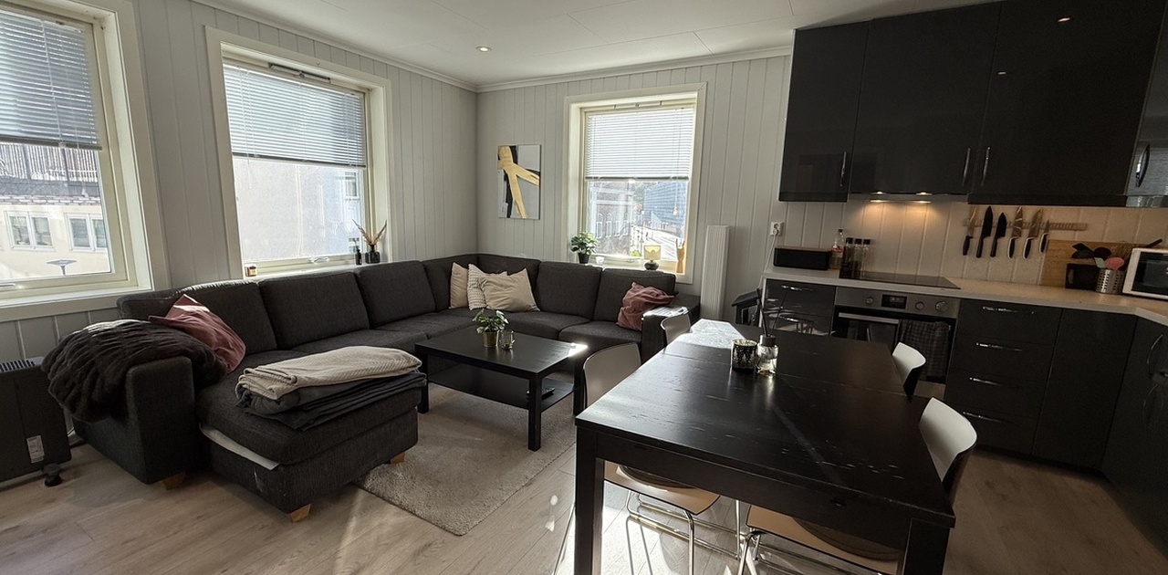 Leiligheten er i underkant av 100 kvm og går over byggets 2 øverste etg. Leiligheten er renovert de senere årene med blant annet nye vegger, gulv, tak, nytt kjøkken, nye vinduer, et nytt bad etc.. Leiligheten inneholder stue med kjøkken, 4 soverom, garderobe, et bad med toalett og dusj, et bad med dusj samt et separat toalett. To av soverommene er ca 15 kvm og de andre to ca 10 kvm. Alle hvitevarer er inkl., herunder vaskemaskin, tørketrommel, komfyr, kjøleskap med frys, oppvaskmaskin, fryser. Senger (120cm) og garderobe på soverommene. Sofa m.v. i stue.