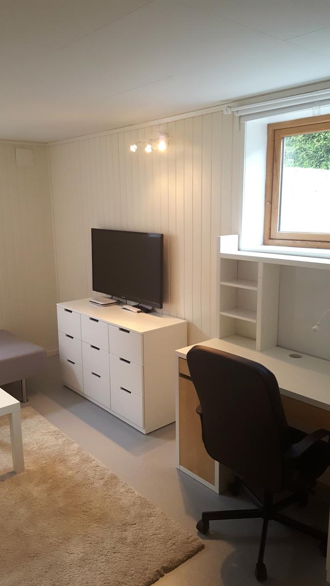 Rommene er fullt møblerte og fremstår som lyse og pene. Seng Sultan 90x200, Micke pult og stort Pax-skap. Skinn kontorstol.