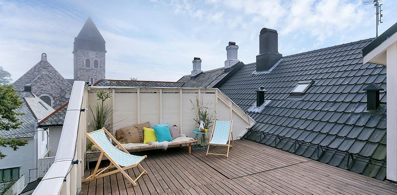 En trapp opp fra leiligheten er det en 5 kvm bod, og 27 kvm felles takterasse.