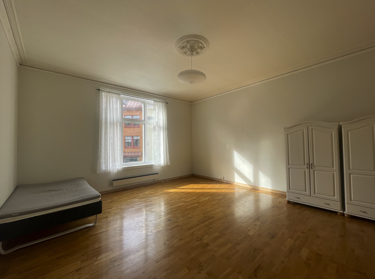 Rommet har godt takhøyde ( over 3 meter) og et stort vindu ut mot Nygårdsgaten. Nygårdsgaten er en aktiv gate, så det er ikke et stille, rolig sted på landet. Det er egen lås på rommet.