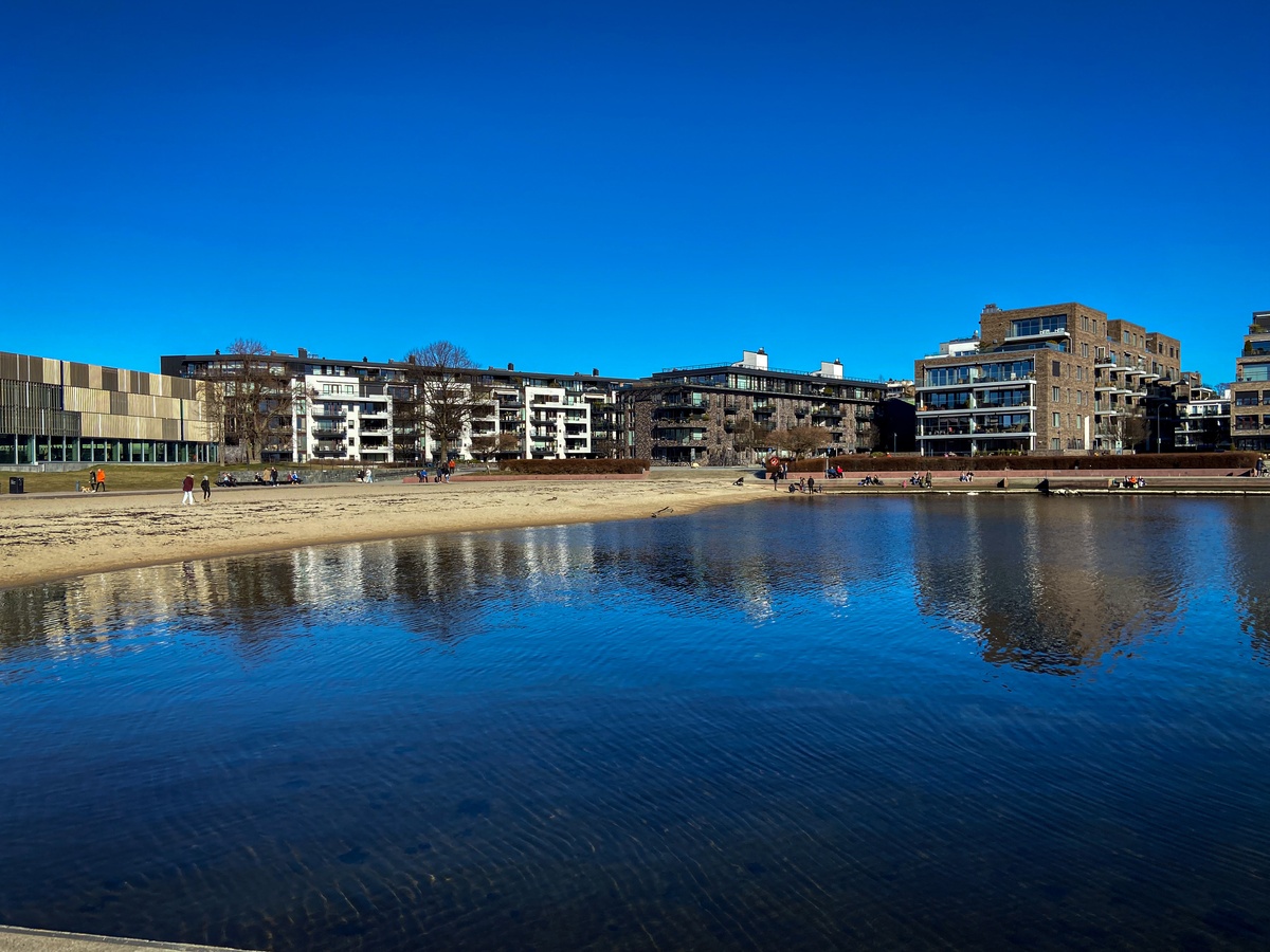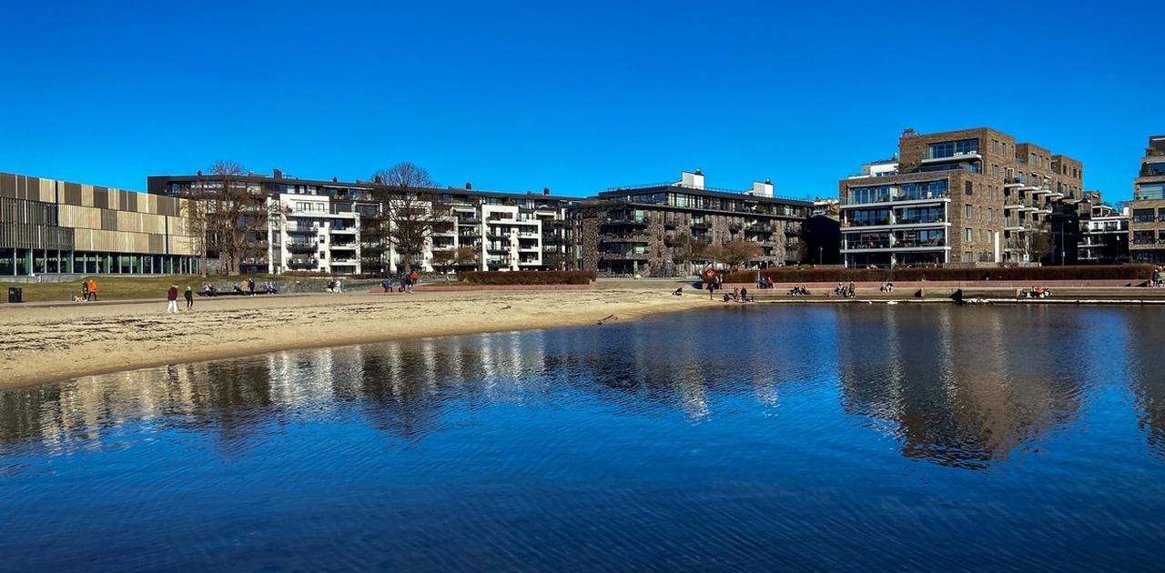 - en stor felles takterrasse med topp solforhold og utsikt over bystranda, sjøen, og store deler av Kristiansand sentrum