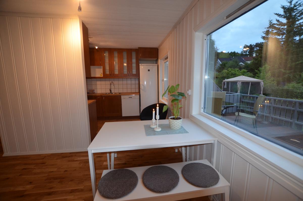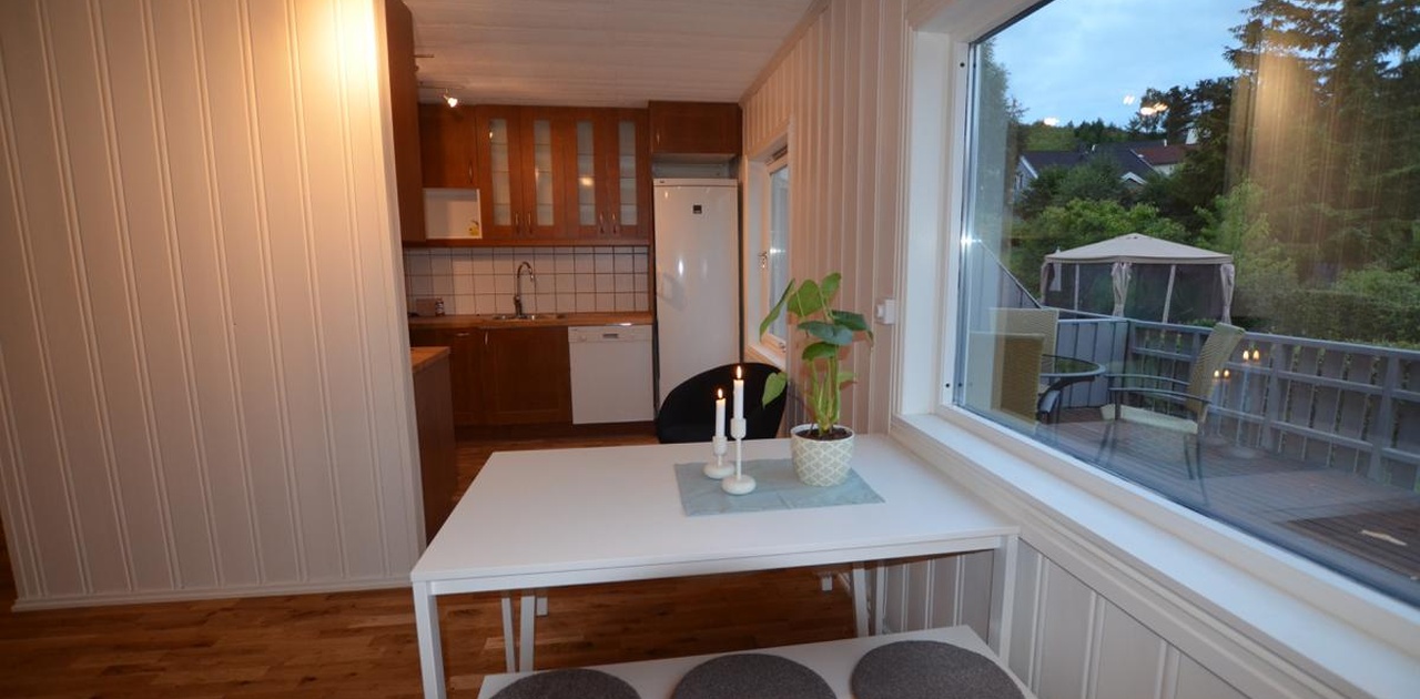 Leiligheten er lys og fin med både terrasse og plen. Leiligheten har seks soverom to bad og to stuer. Kjøkkenet inneholder alt en trenger av hvitevarer. Leiligheten har en stor, solrik og lun terrasse med sol fra kl 9 til 21. Raskt friberbredbånd er installert og inkludert i leieprisen.