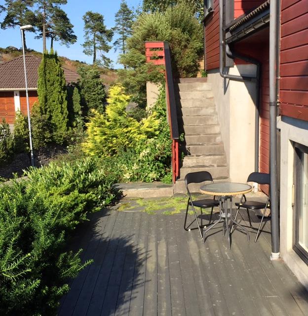 Hybelen har egen inngang med uteplass hvor det er sol sen ettermiddag og kveld.