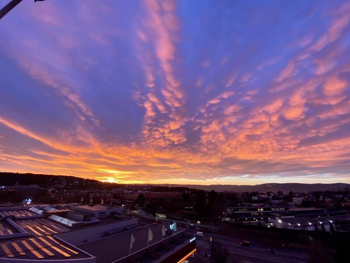 Leiligheten ligger i 11. etasje (heldigvis med to heiser) og har flott panoramautsikt over Oslo. Solnedganger kan nytes fra den vestvendte balkongen.