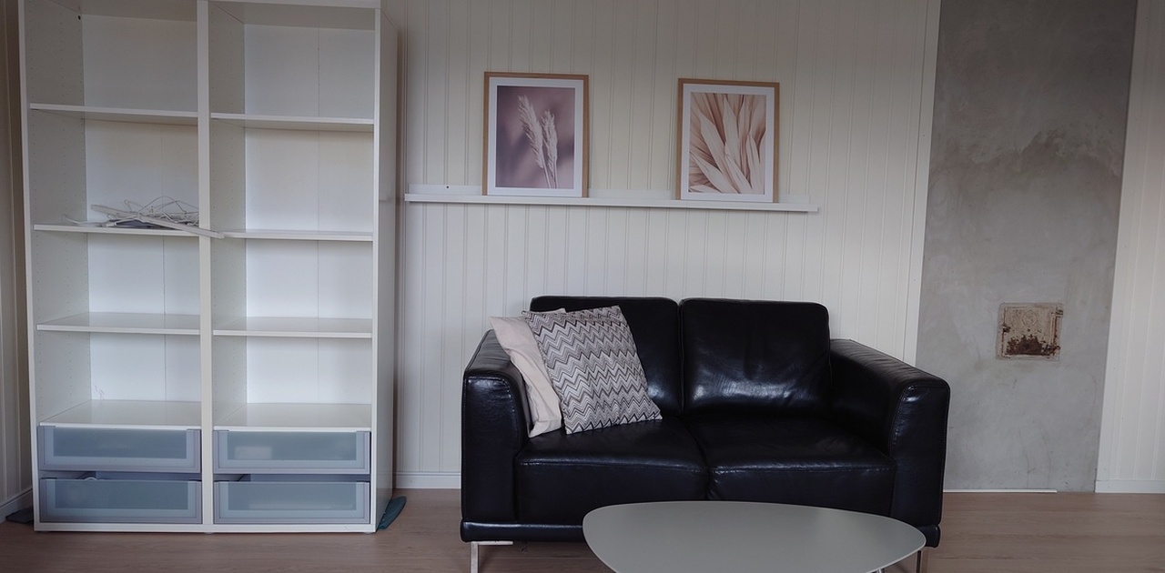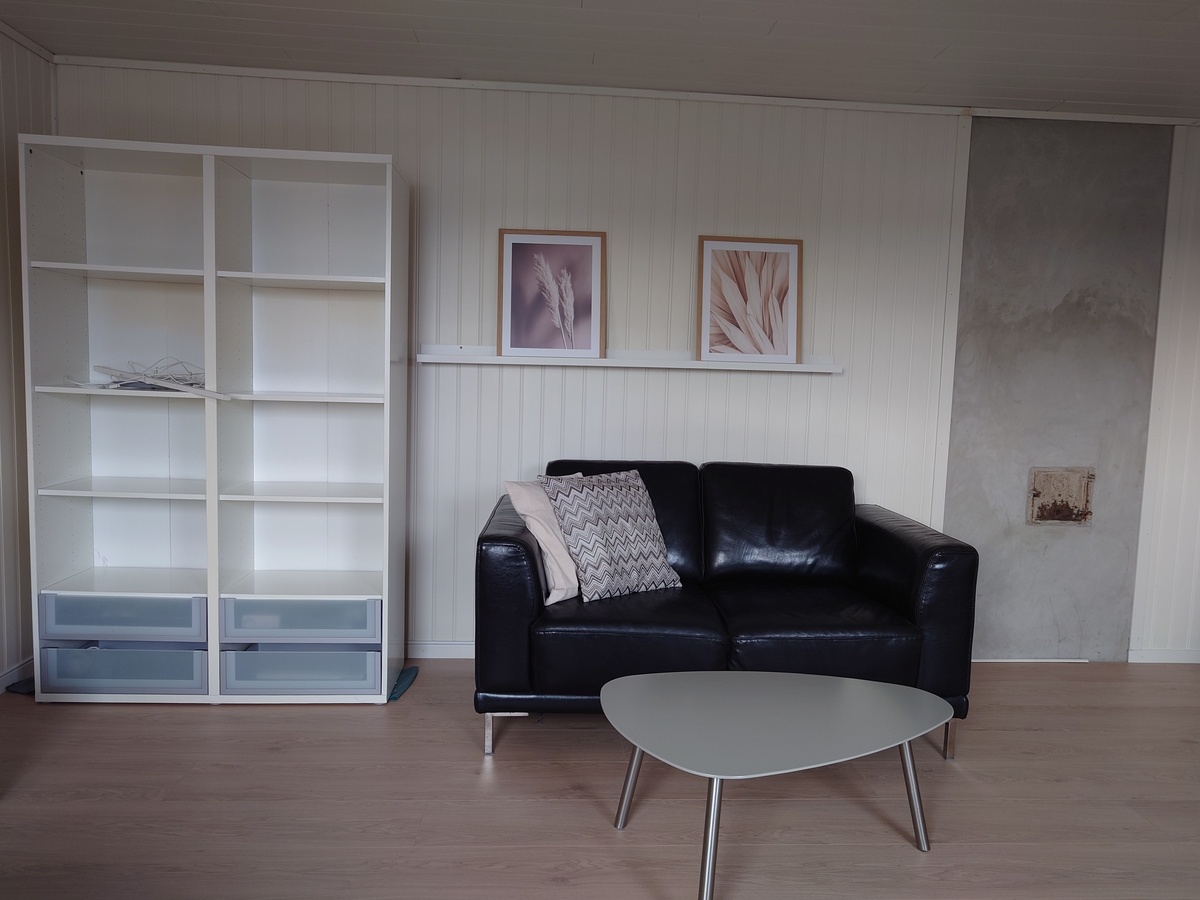 Lys stue med utsikt som er møblert med sofa, bord, bokhylle og tv. Nytt gulv.