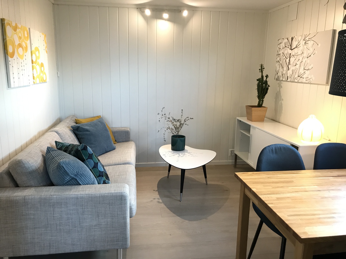 Stuen er møblert, og leiligheten har panoramautsikt til byen og fjorden. Soverommene er møblert med 120x200 seng, skrivebord, hyller/kommode og garderobeskap. Leien inkluderer strøm, oppvarming og internett.