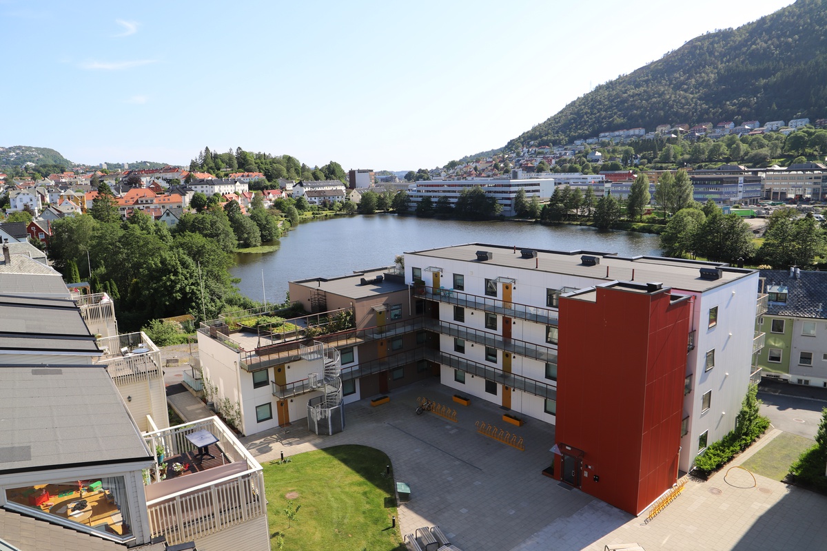 Leier ut del i leilighet. Leiligheten er 61 kvadratmeter og er i et nybygg fra 2017. Leier ut det ene av to soverom på ca. 10 kvadratmeter. Stue, kjøkken og bad disponeres fritt. Det er stue med åpen kjøkkenløsning, med utgang til en balkong med utsikt over Solheimsvannet. Der er også tilgang til store, fine takterrasser. Det er et bad med vaskemaskin og tørketrommel inne i leiligheten, og det er bod i kjelleren til oppbevaring av ski etc.