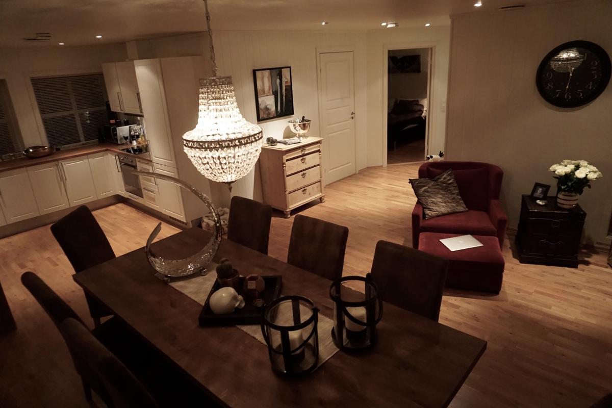 På kjøkkenet medfølger alt av hvitevarer, komfyr med platetopp, kjøleskap og fryser. Stor oppvaskmaskin, stor kjøkkenbenk og mye skapplass..