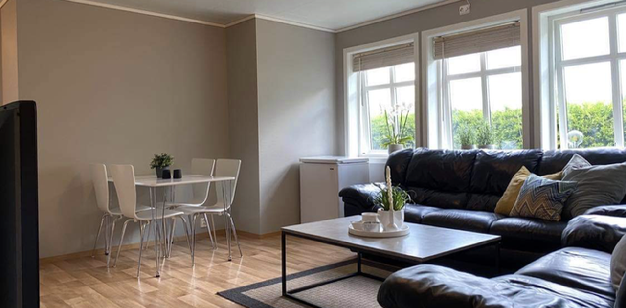 Stova inneheld sofagruppe,spisebord og 55”Smart-TV