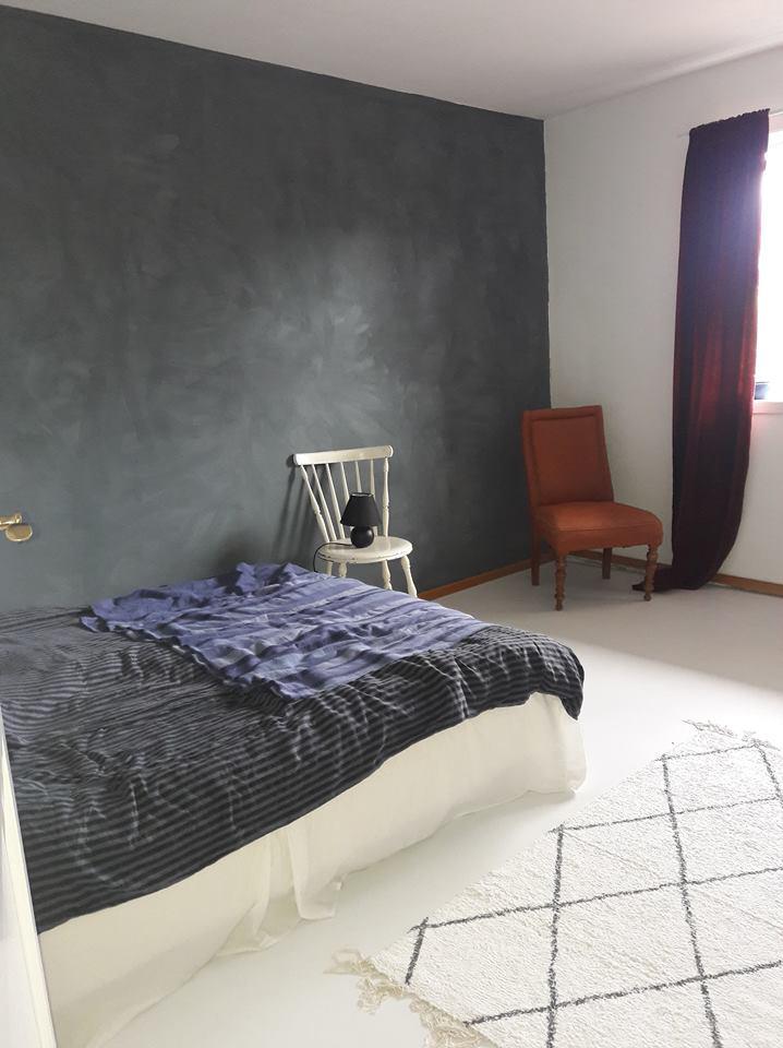 Rommet er møblert med seng, gjeste-madrass, gjeste-seng, skrivebord og stol og toseter sofa.