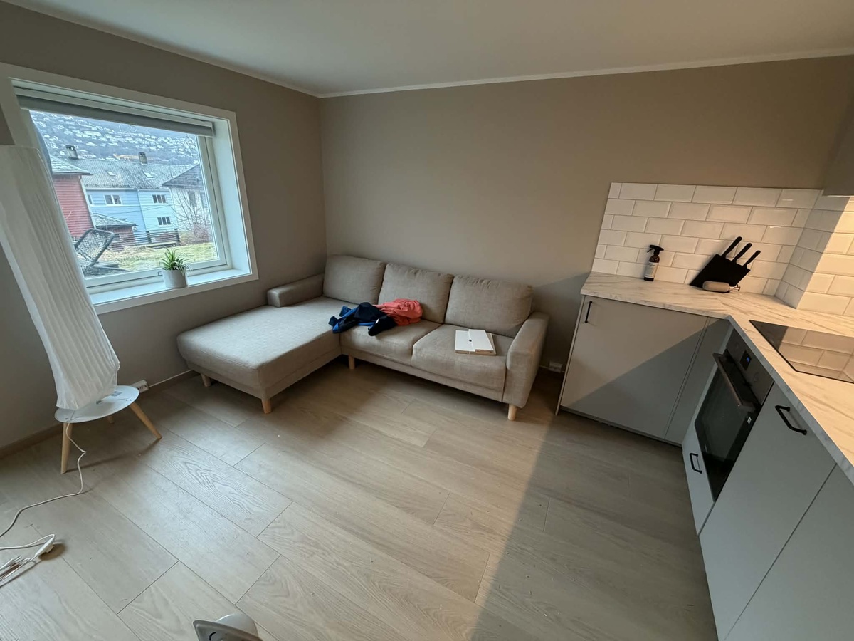 Kombinert stue og eit heilt nytt kjøkken. Flislagt bad.