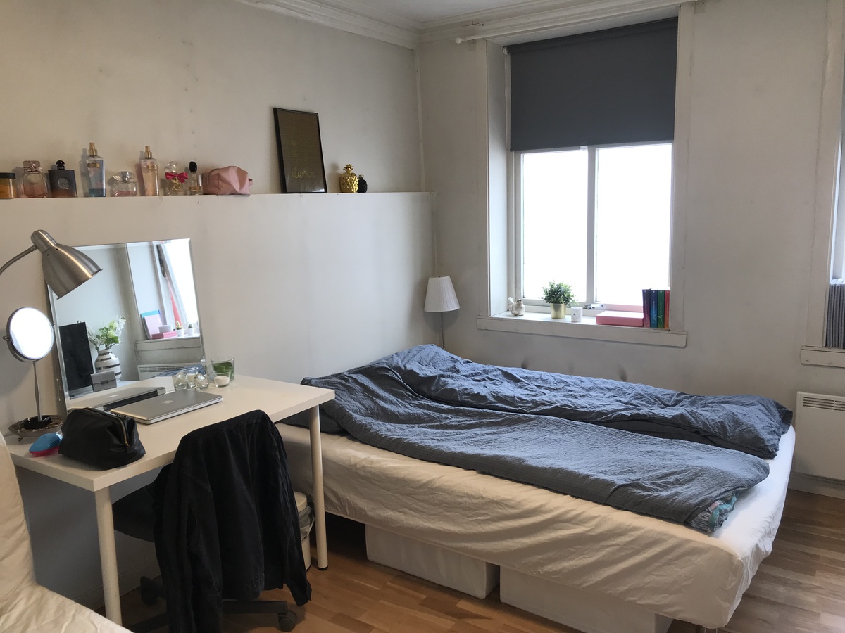 Stort rom i svært sentral leilighet med kort vei til BI, UiB og Bybanen. Det er Kiwi-butikk rett rundt hjørnet, og flere kafeer/restauranter i området.