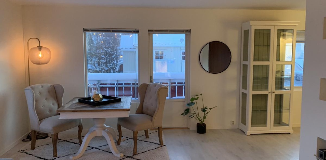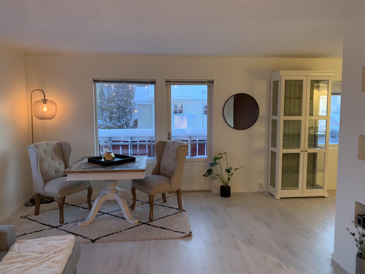 Pen 3-roms sentralt i Bodø sentrum leies ut for langtidsleie. Alt av møbler og hvitevarer er inkludert, i tilegg til internett. Egen seng må ordnes til det ene soverommet. Ledig fra 1 november. Noen av møblene på bildene er byttet ut.