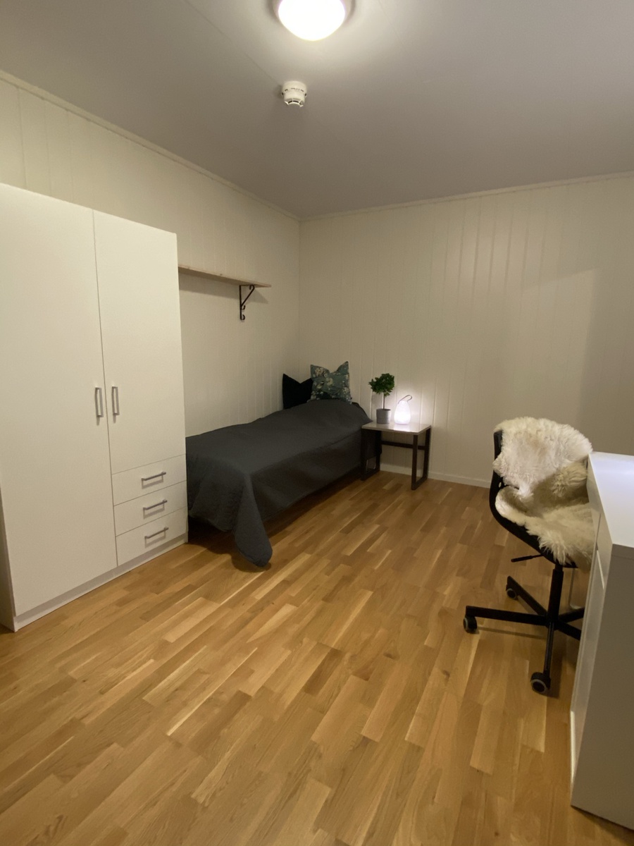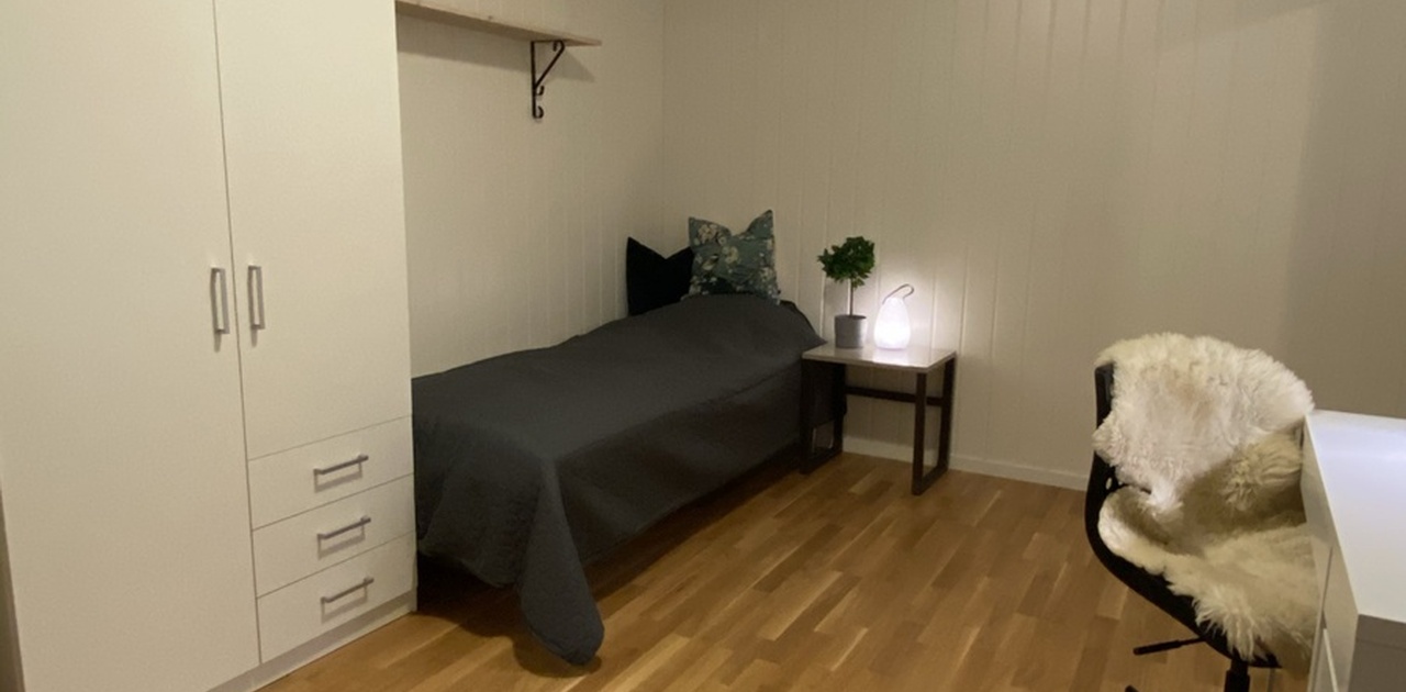 Hybelen er ca. 16 kvm i tillegg til felles kjøkken/inngang på 8 kvm. Leien inkluderer strøm og internett.