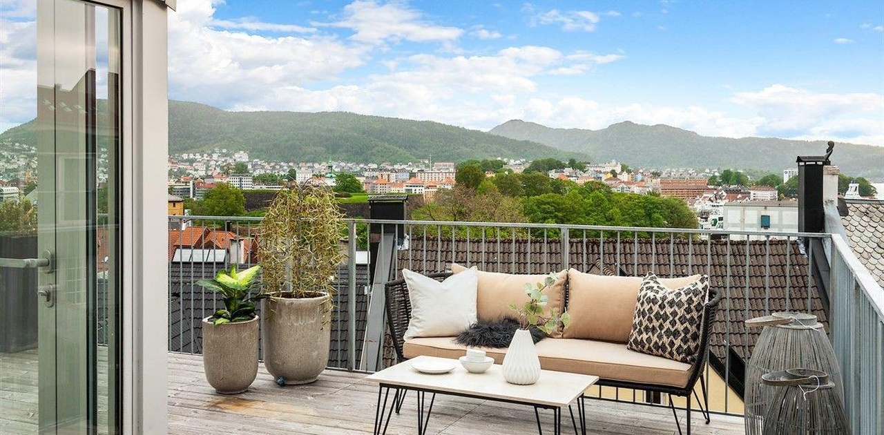 Vestvendt takterrasse med direkte adkomst fra stuen.