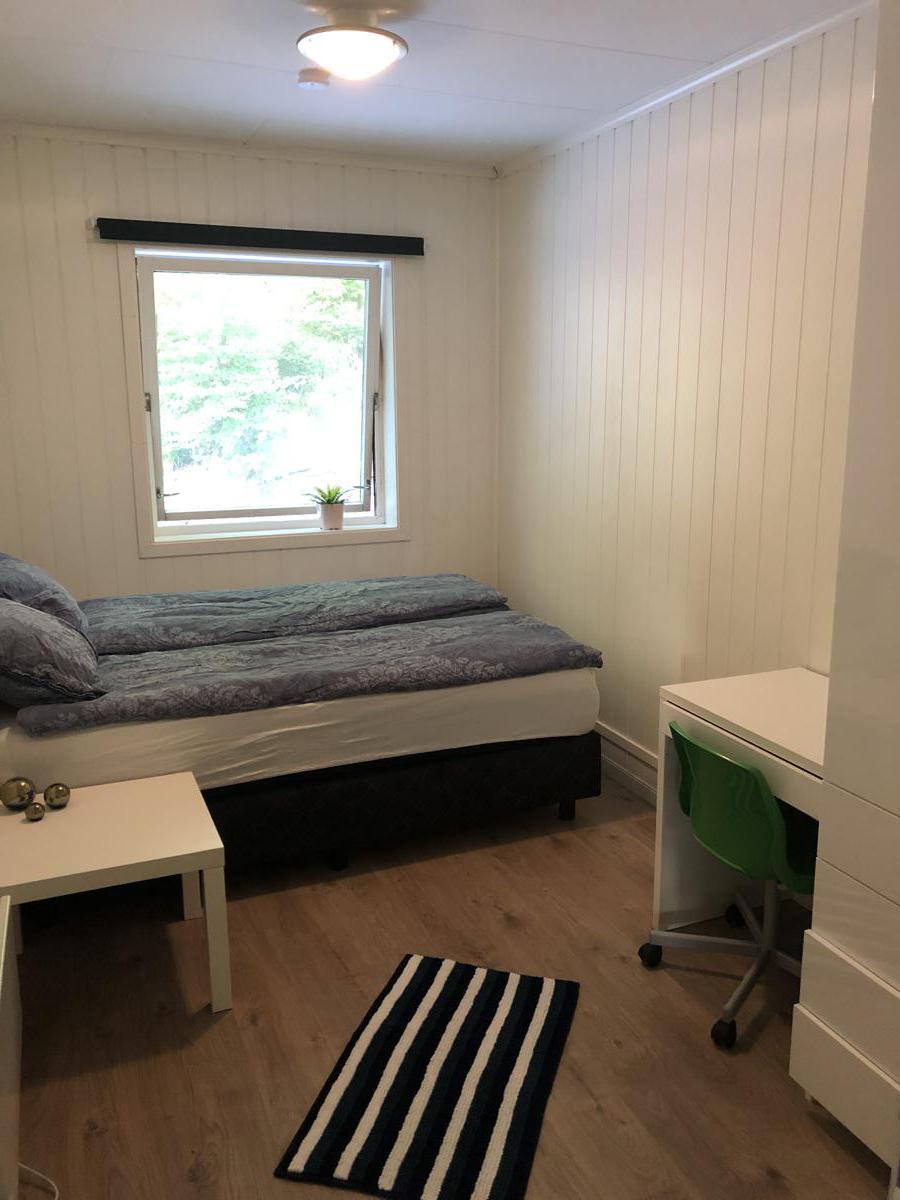 Rommene er møblert med seng, stol, skrivebord og garderobeskap. Kjøkken er utstyrt med bestikk, glass, kopper, fat, gryter osv.