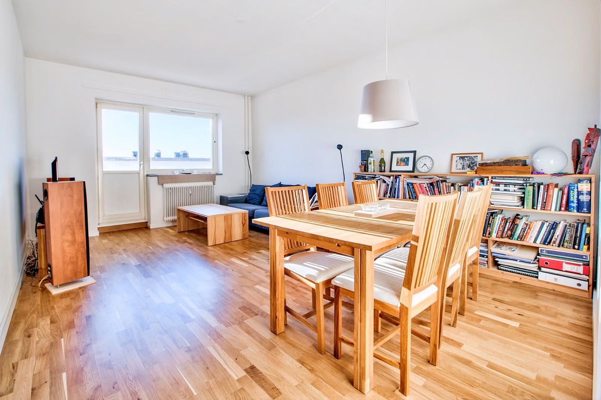 This 22 m2 room has access to a 4 m2 balcony. The room is apartment's living room. The bedroom (other room) is rented out to a quiet, adult man who travels frequently. The kitchen and bathroom are shared.