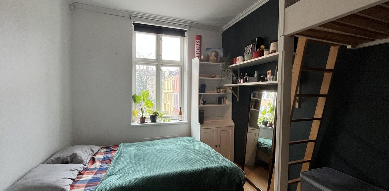 Rommet er på ca 12 kvm. Selv har min storesøster bodd i leiligheten 10 år før meg og jeg har snart bodd her i 7 år. Jeg er veldig fornøyd med eieren som er veldig imøtekommende og fleksibel. I naborommet flytter inn mann (28 år) 1. mai.