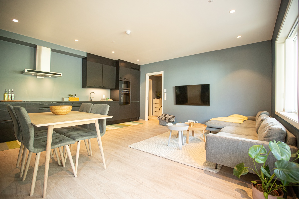 Leiligheten ligger sentralt til i Sogndal sentrum. Her bor du i et rolig og lite traffikert område, samtidig som du har kort vei å gå til det meste. Ca. 10 minutter å gå til Fosshaugane Campus hvor du har tilgang på treningssenter, idrettshall, høyskole og videregående. Amfi Sogningen ligger også 10 minutters gange unna.