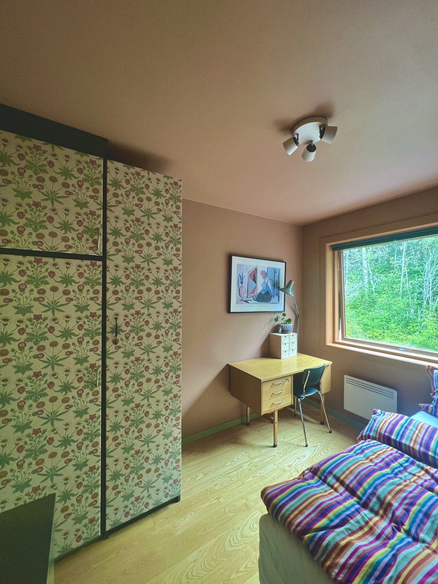 Rommet som leies ut er 8 kvm, og innredet med seng, kommode, god skapplass og skrivebord. Utsikt til grøntarealer på alle sider av leilighet. Soverommet ble pusset opp for 1 år siden, god atmosfære.