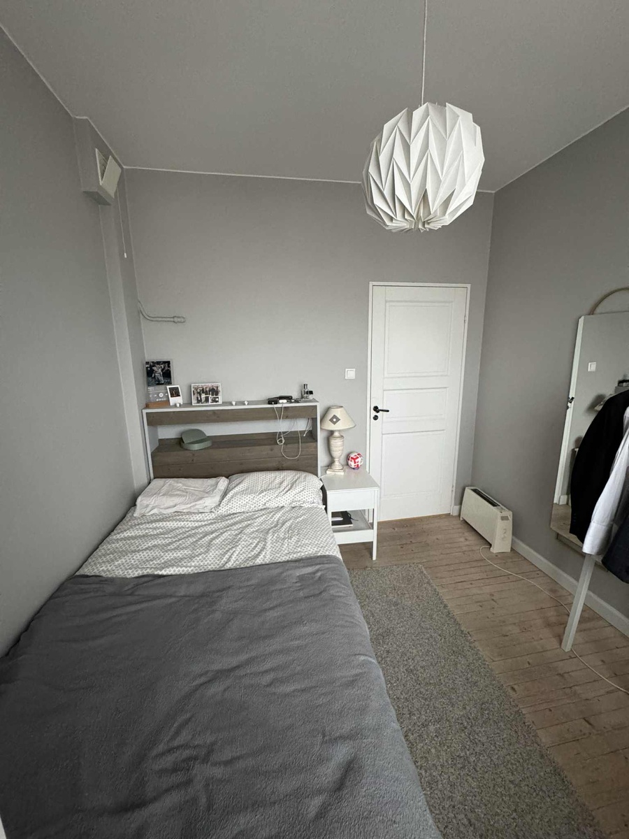 Rommet inneholder komfortabel seng 120*200, skrivebord og garderobe. Baderommet som inneholder dusj, toalett og vaskemaskin er praktisk plassert rett overfor rommet og deles med en ung dame.