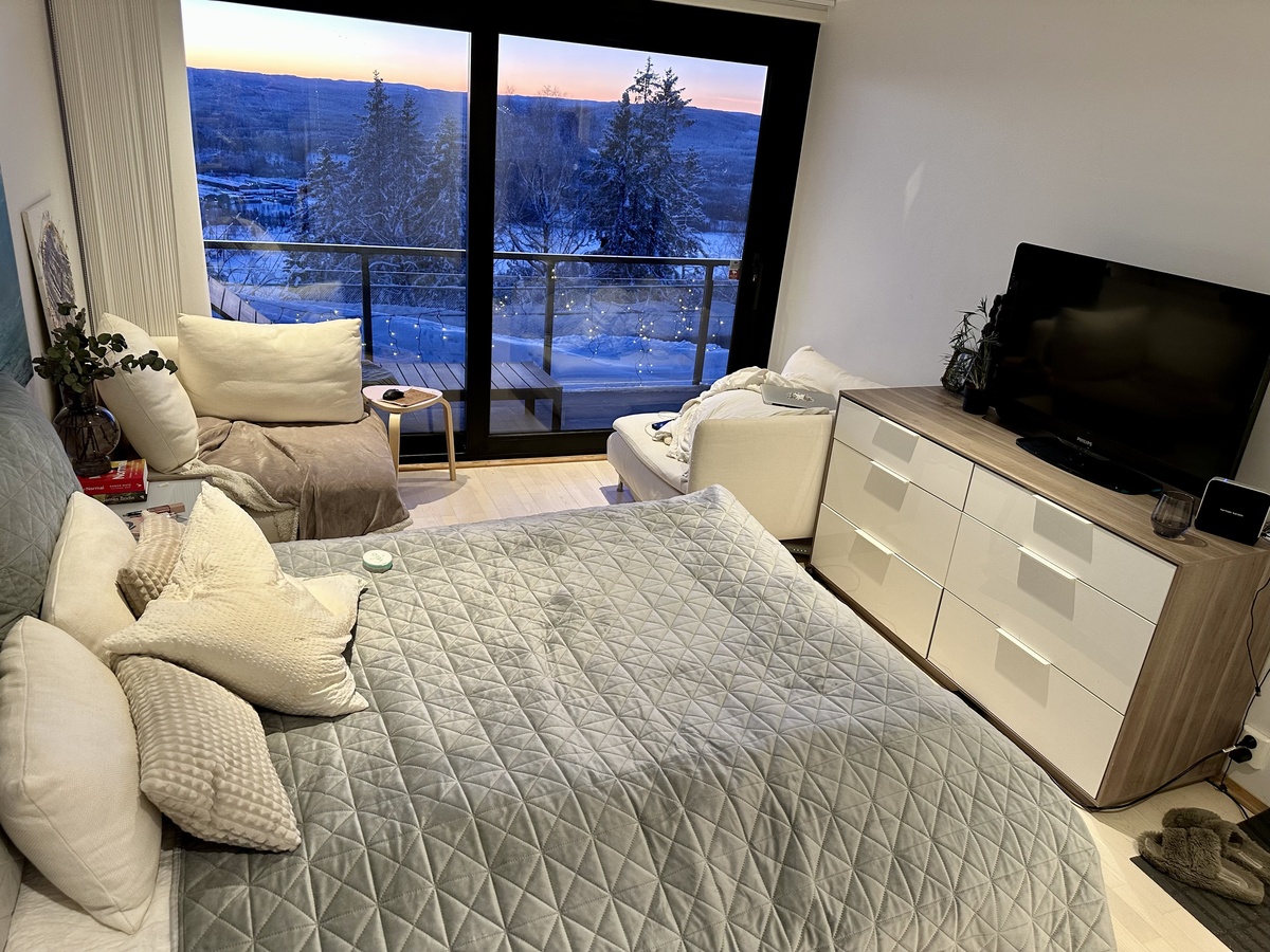 I enebolig oppført i 2013 har jeg nå 2 hybler ledige for utleie. (Den andre hybelen leies ut for 9500 kr/mnd og har egen annonse). Denne hybelen har en hel vegg av glass og en veldig fin utsikt. Beliggende på Holmenkollens vestside, ca 200 m til Skogen stasjon på Frognerseterbanen (linje 1). Banen går hvert kvarter. 28 minutter til Nationaltheatret stasjon med bane, 15 minutter med bil (uten trafikk). Nattbuss i helgene. Umiddelbar nærhet til Marka - svært gode turmuligheter både sommer og vinter. Hybelen leies ut til en kvinnelig, rolig ikke-røyker. Felles kjøkken, spiseplass og balkong med to andre hybler/kvinner. Tilsammen er det tre hybler i huset, de to øvrige ligger i etasjen over. Kjøkken er komplett utstyrt med Siemens hvitevarer, inklusiv oppvaskmaskin, induksjon steketopp, kjøl/frys, separat fryser, og kombinert stekeovn/microovn. Kjøkkenet har spiseplass for opptil 8 personer og utgang solfylt vestvendt balkong med solstol og spisebord. Hybelen har sitt eget, integrerte bad, med ny Samsung vaskemaskin/tørketrommel. Heis. Bod. Parkett Ask White Pearl på gulvet, store lyse gulvfliser på kjøkkenet. Varme i alle gulv. Opplegg for Telia kabel-tv og internett på hver hybel. Dørtelefon med kamera. Leie kr. 10.500 pr måned. Leien inkluderer strøm/oppvarming, tv-kanaler og bredbånd. Hybelen har møbler fra IKEA, inklusiv dobbeltseng 200 x 160, to sofahjørner, en stor kommode og to småbord. Kort spasertur til Holmenkollen Skianlegg. Tre gode restauranter i nærområdet. Svømmebasseng på Holmenkollen Park og Lysebu, 1000 kvm gym på Holmenkollen Park (Move). Nærområdet har tre idrettsklubber med mange tilbud; Heming, Try og Ready. En fin bolig for en som er glad i vid utsikt og flotte solnedganger, samt nærhet til både turterreng og offentlig kommunikasjon.