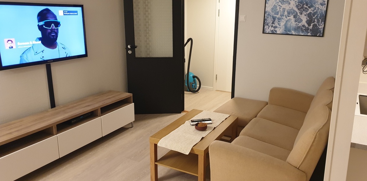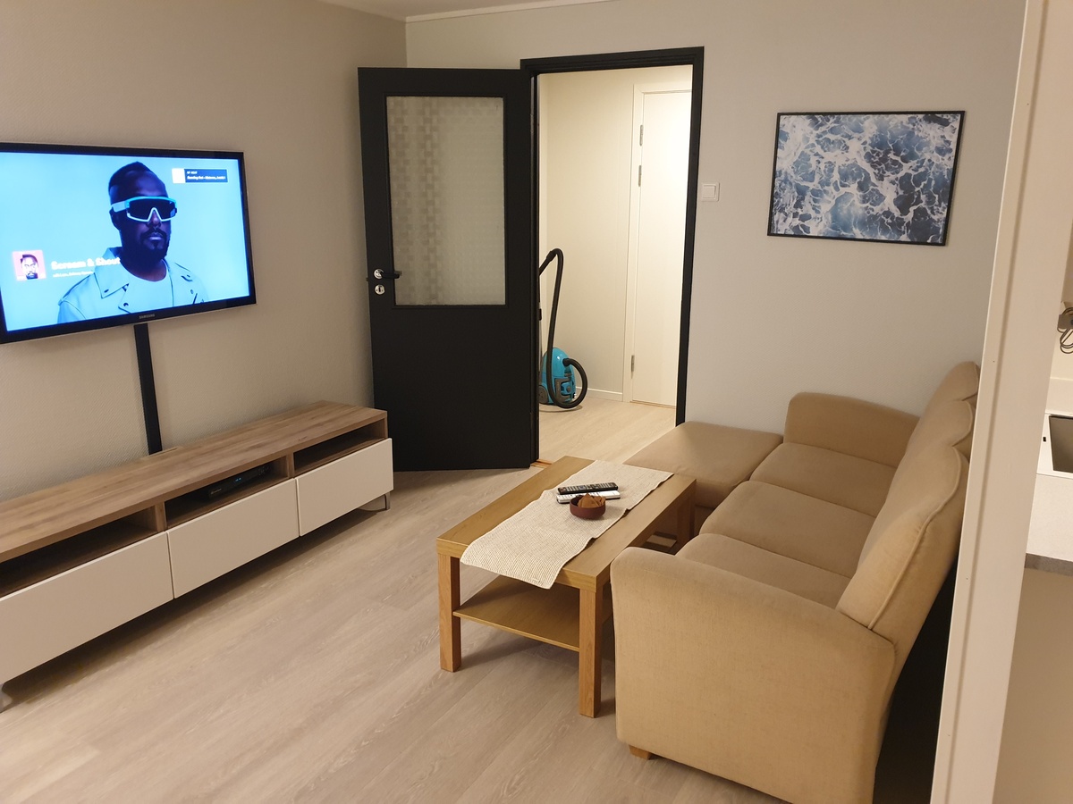Bildene ble tatt før nåværende leieforhold, det er nå gjort plass til vaskemaskin og tørketrommel på bad. Det er også satt inn ett høyskap ved siden av kjøleskap og montert spotskinne over der hvor sofaen står per i dag.