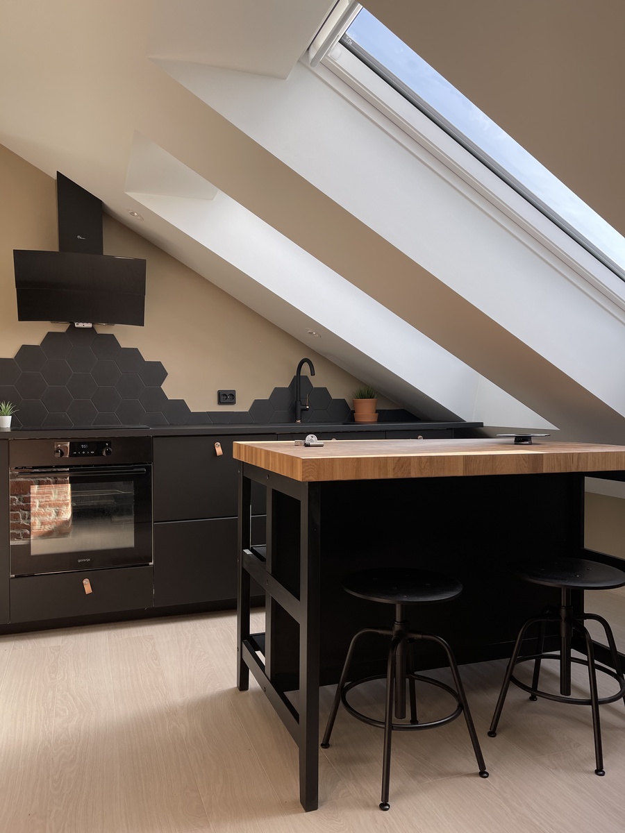 Gangrommet utenfor leiligheten er innredet med gode løsninger for lagring av sko og jakker. Leilighetene har et innbydende kjøkken med smarte løsninger med god arbeidsplass. Kjøkkenet har integrerte hvitevarer som oppvaskmaskin, induksjonstopp, ovn, kjøkkenøy og et romslig kombi-kjøleskap. Stuen/tv-rommet er en fortsettelse av kjøkkenet og oppleves som romslig på tross av skråtaket. Stuen har en 55-tommer smart 4k tv som inkluderes i leiligheten.