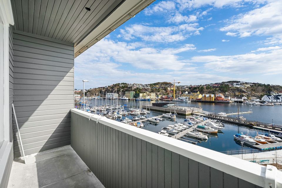 Fra terrassen og balkongen er det flott utsikt mot Kranaskjæret og havna. Hagemøbler følger med.