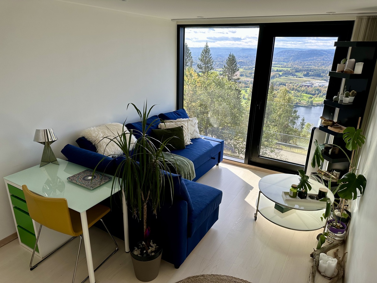 I enebolig oppført i 2013 har jeg hybel ledig for utleie. Hybelen har en hel vegg av glass mot vest og en av Oslos beste utsikter. Beliggende i Holmenkollen, 230 m til Skogen stasjon på Frognerseterbanen (linje 1). 28 minutter til Nationaltheatret stasjon med t-banen. Nærhet til Marka - svært gode turmuligheter både sommer og vinter. Hybelen leies ut til én rolig ikke-røyker, som må være kvinne pga at hun deler bad med en annen kvinne. Felles kjøkken, spiseplass og balkong. Tilsammen er det tre hybler, de to øvrige er leid ut til to sympatiske jenter. Kjøkken er komplett utstyrt med Siemens hvitevarer, inklusiv oppvaskmaskin, induksjon steketopp, kjøleskap, fryseskap og kombinert stekeovn/microovn. Kjøkkenet har spiseplass for opptil 8 personer og utgang solfylt vestvendt balkong med spiseplass og solstol. Den ledige hybelen i 3. etasje deler bad, vaskemaskin/tørketrommel og separat wc med en annen jente. Heis. Bod. Parkett Ask White Pearl på hyblene, store lyse gulvfliser på kjøkkenet. Varme i gulvet. Dimbart lys alle steder. Opplegg for Telia kabel-tv og internett på hver hybel. Dørtelefon med kamera. Leie kr. 9.500 pr måned. Leien inkluderer strøm/oppvarming samt internett og tv-signaler. Leies ut møblert.