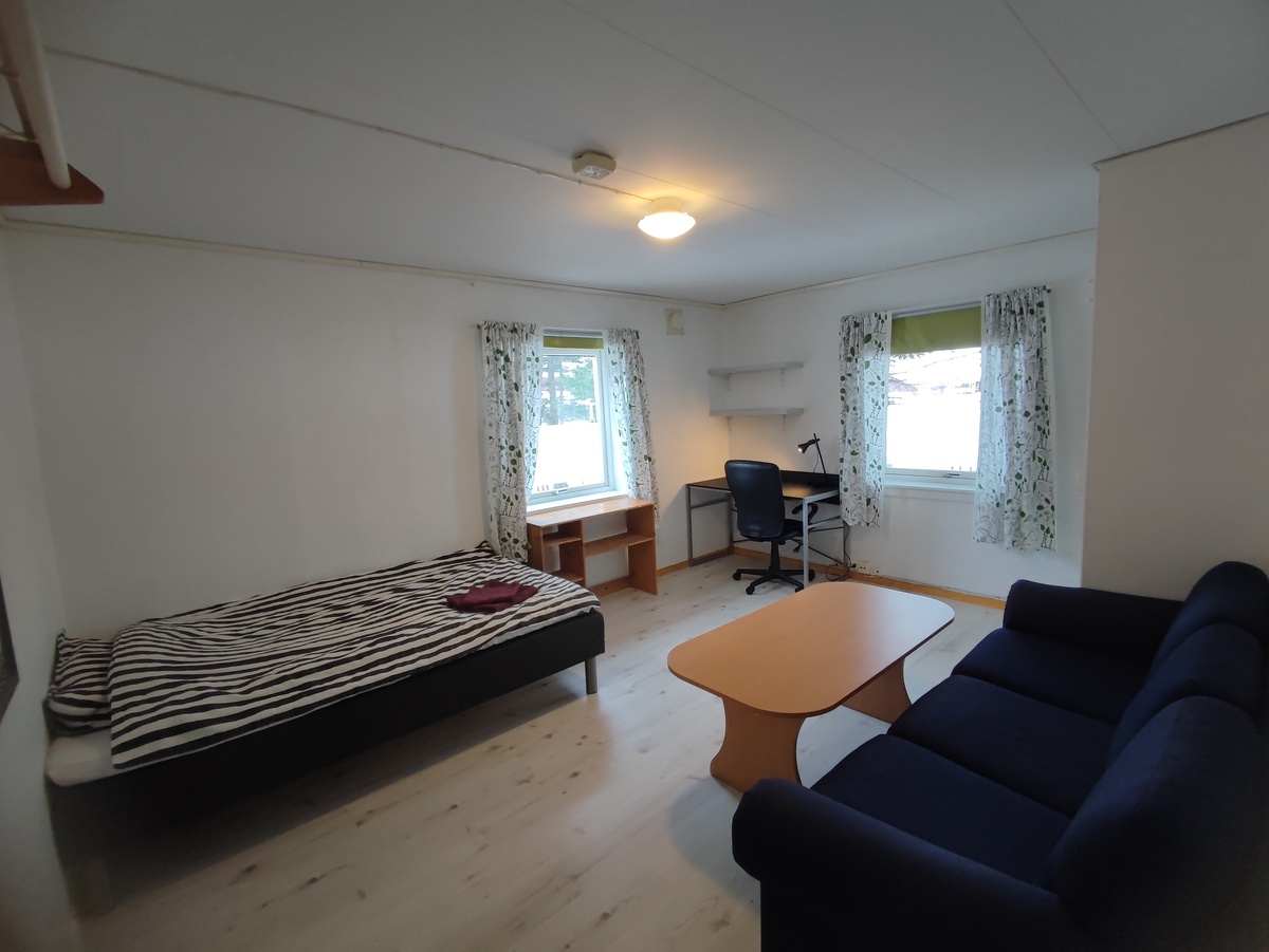 Rom nr 1 er ca 18 kvm, full møblert som vist i bilde med seng (150 x200 cm).