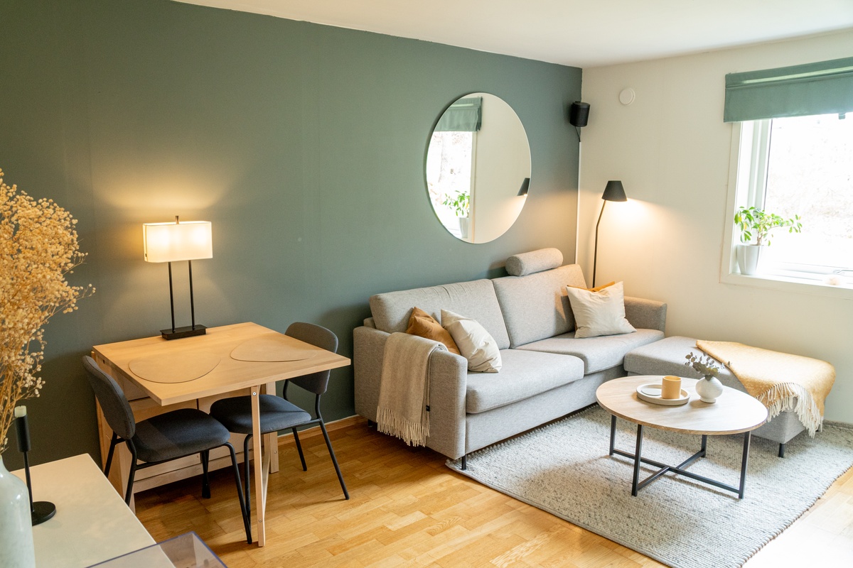 Trivelig hageleilighet på 44 kvm i rolig boligområde sentralt i Åsane. Leiligheten har stue, kjøkken, bad (nytt i 2019) og soverom. Det er også et disponibelt rom som har vært benyttet til soverom av tidligere leieboere. På kjøkkenet er det rikelig med skapplass og i gangen er det skyvedørsgarderobe med god plass til oppbevaring av klær og utstyr. Av hvitevarer er komfyr, kjøleskap m/frysedel og vaskemaskin. Internett er inkludert i leien. Nye laminatgulv ble lagt i 2026 (de gamle vises på bildet).