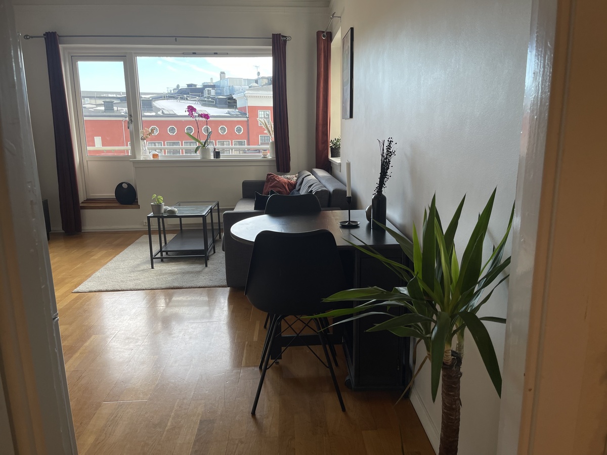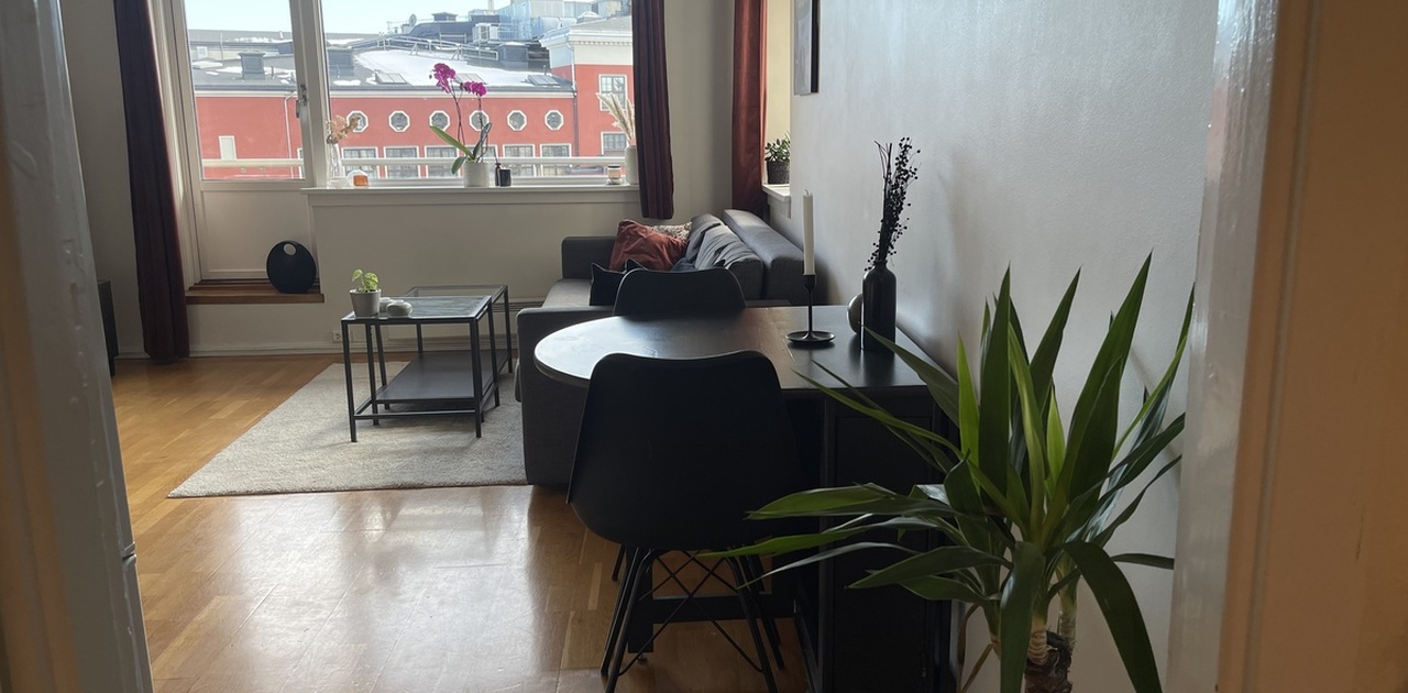 Stue/kjøkken i åpen løsning: Pen og lys stue med utgang til balkong med formiddagssol. Store vindusflater som gir gode lysforhold (du kan se fjorden i det fjerne). God plass til spisebord og sofagruppe. Parkett på gulv. Malte flater og malt himling. Godt med skapplass på kjøkkenet. Komfyr, kjøl/frys og oppvaskmaskin følger med. Det elektriske anlegget ble sjekket og oppgradert i 2025. Ny varmtvannsbereder i 2025. Bilder av stue er fra tidligere leietakere for å vise møbleringsmuligheter.