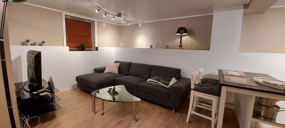 Bad med wc, dusj, vaskeservant med skuffer og skap, vaskemaskin og tørketrommel. Stue med skatoll, spisestue og salong med åpen kjøkkenløsning. Det er sofa, bord, TV, spisestue, internett og TV kanaler. Fullt utstyrt kjøkken. Dyrehold kan diskuteres.