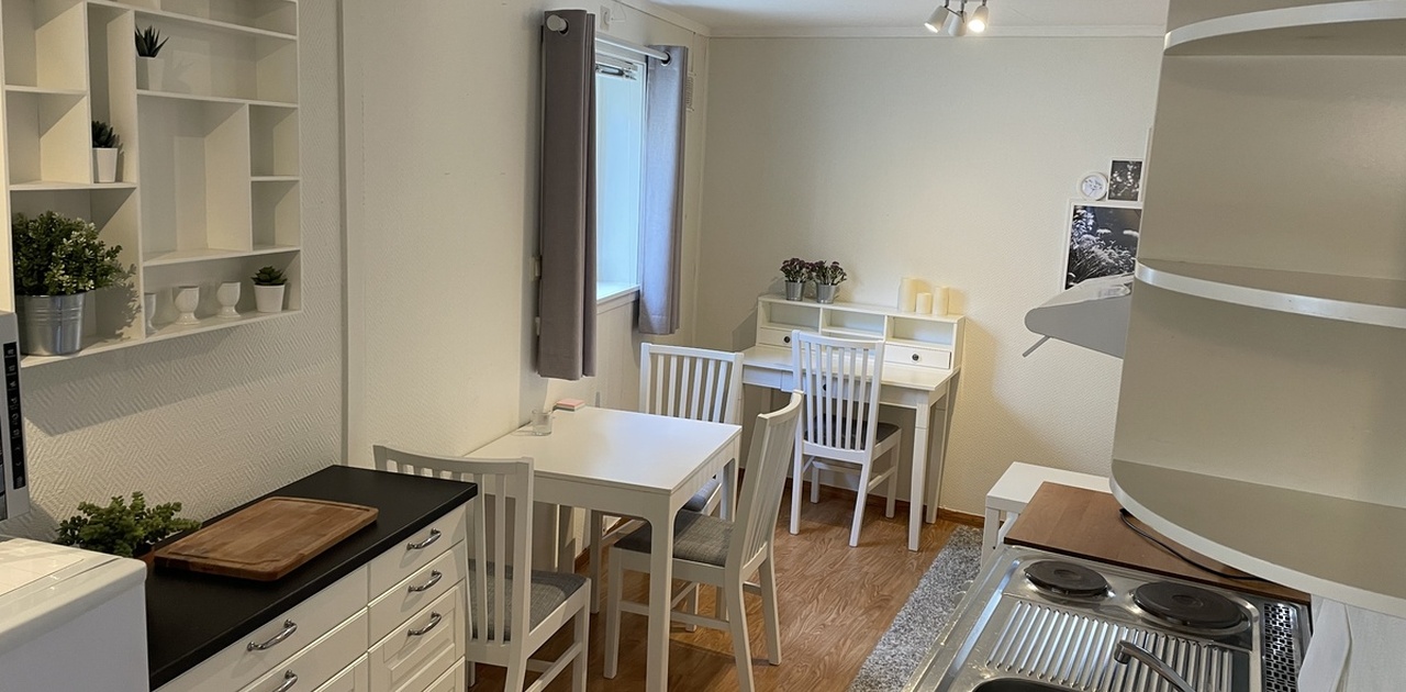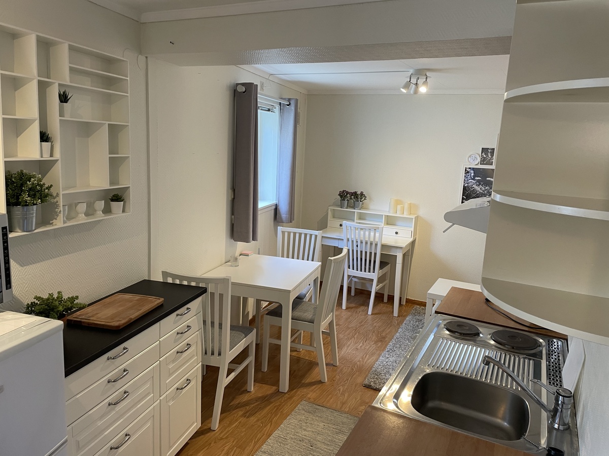 Boligen er enkelt og funksjonelt innredet med seng, sofa, skrivepult og spisebord – alt du trenger for å flytte rett inn og føle deg hjemme fra første dag.