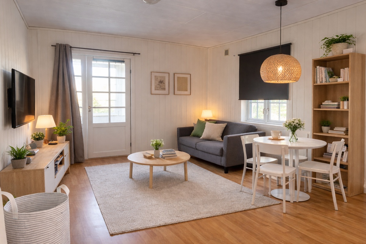 Standard utstyrt kjøkken og alle hvitevarer medfølger. Stue er under bygging, og vil bli ferdigstilt til 1. august. Bildet er AI-generert, men man kan forvente at rommet består av samme type møblement (sofa, TV, spisebord og 4 stoler).