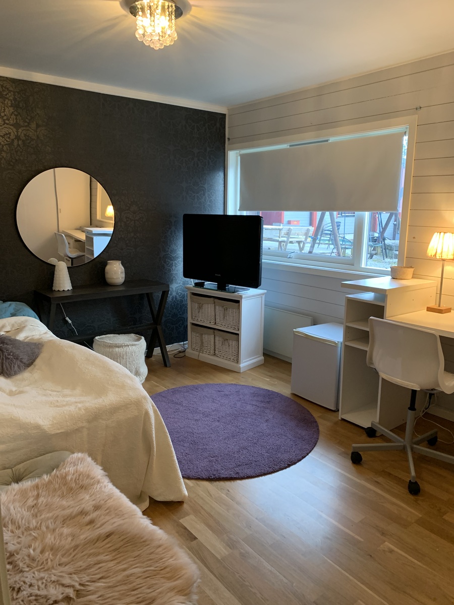 Stor møblert hybel nær sjukehuset og sykepleierskolen til leige for korttids og langtidsleige for roleg jente. Rommet er 12 kvadrat og har eige lite bad.Følger med stor tv med Appletv, lite kjøleskap og stort garderobeskap.