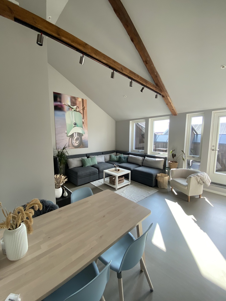 Er vi i Kristiansand? Loftsleilighet MED 3 SOVEROM. Synlige bjelker under tak, stor takhøyde og egen takterrasse MIDT i byen. Egen inngang fra felles takterrasse like utenfor døren. Ingen naboer over deg og tilgjengelig utearealer rett utenfor døren.