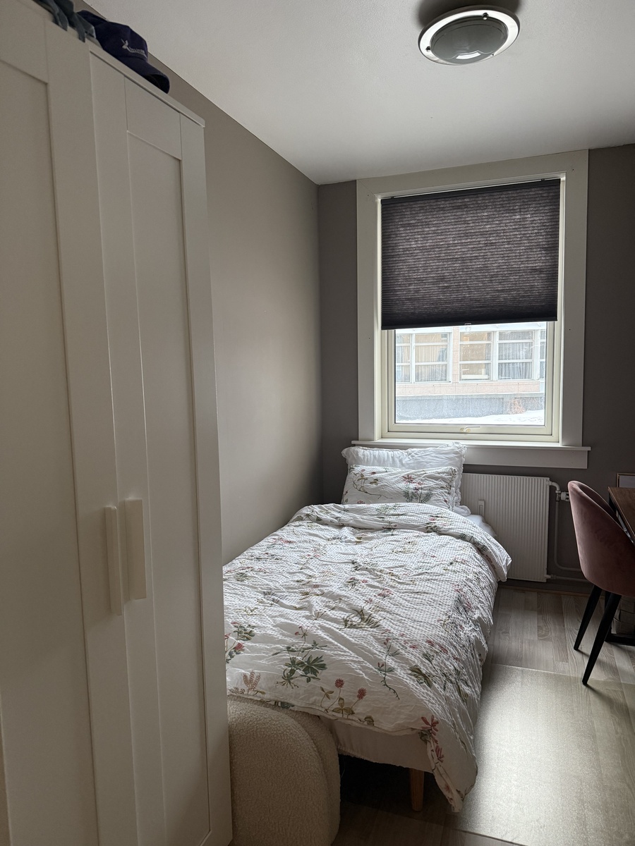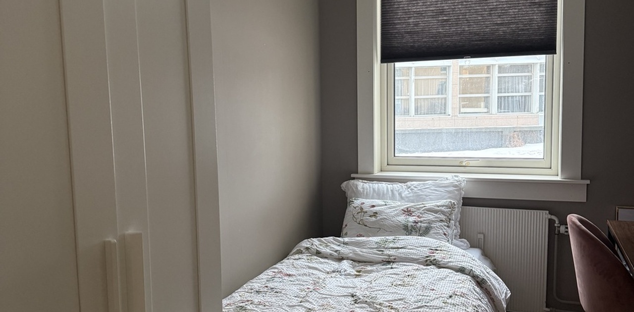 Leiligheten er 53 kvm og har to soverom. Soverommet som leies ut er ca 6,5 kvm og vil være møblert med et skap, vegghengt skap, skrivebord og en seng (sovesofa 100cm bred). Det er alt av hvitevarer (kombinert vaskemaskin og tørketrommel på badet) og det man trenger i leiligheten, så du trenger kun å ta med dine ting til soverommet. Ingen dyr eller røyking tillatt i leiligheten.