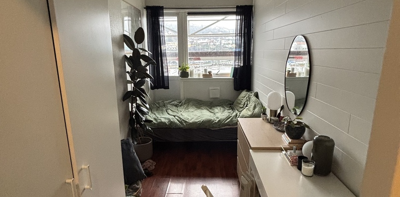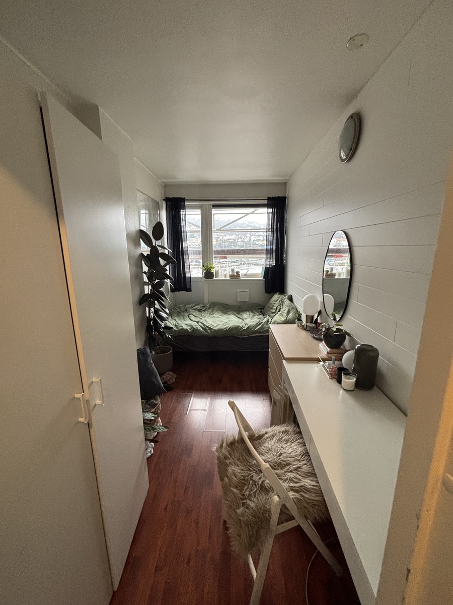 Leiligheten har svært god beliggenhet da den er midt i sentrum ved Bergen busstasjonen og er i god stand. Soverommet har utsikt til Fløyen og Ulriken, med egen balkong til rommet (størrelsen oppgitt på rommet er et estimat). Ellers er det god størrelse på fellesarealet med tilhørende stue, kjøkken og bad. Badet har også vaskemaskin og tørsketrommel. Det bor i tillegg to hyggelige jenter der på 24-25 år som er studenter.