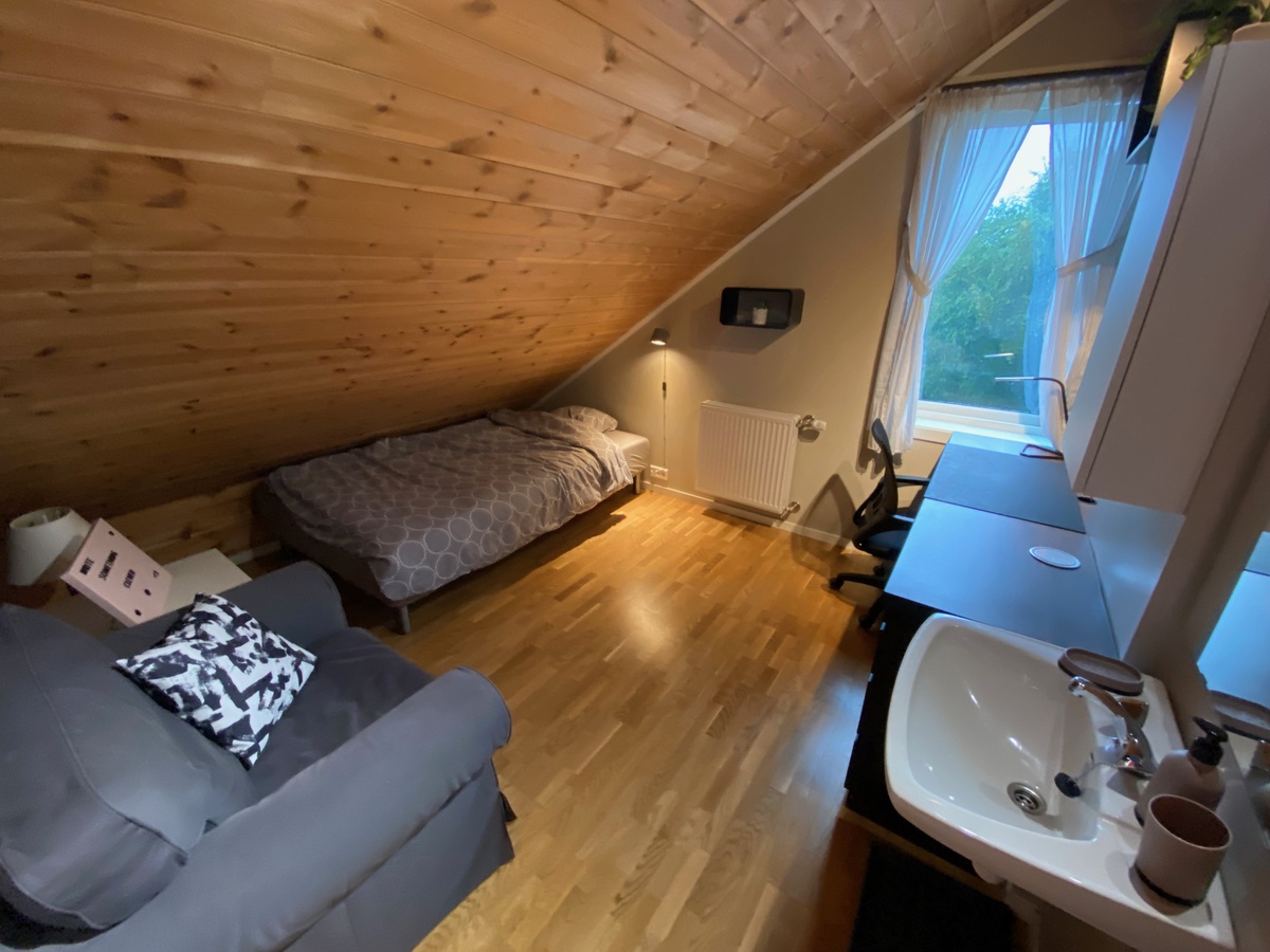 Rom i bofelleskap med tilgang på bad som deles på 4 i 3 etasje. Kjøkken deles med 2 etasje. Vaskerom, TV-stue, kjøleskap, fryser, hvitevarer. Wifi6 trådløst nettverk eller fast nettverksuttak med 500/500Mb fiber bredbånd. KabelTV i fellesrom. Gulvareal ca 15 kvm oppgis mindre pga skråtak. Romnummer 32