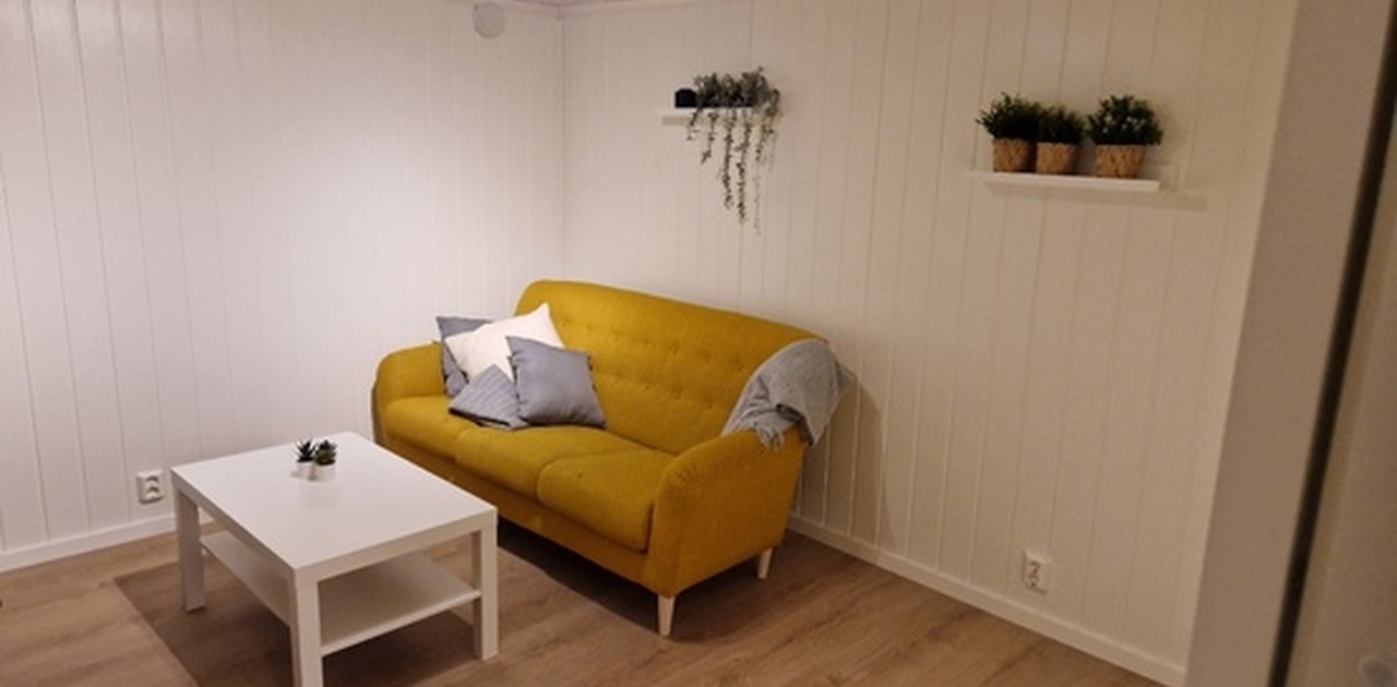 - Fullt møblert (soffa, stuebord, tv-benk, hyller på vegg til personlige bilder. Det er også ett delvis åpent rom som brukes som soverom, seng i rommet og nattbord. Fliselagt bad med varmekabler, dusjkabinett, toalett, vaskemaskin og tørkestativ. Egen inngang med vindfang.
