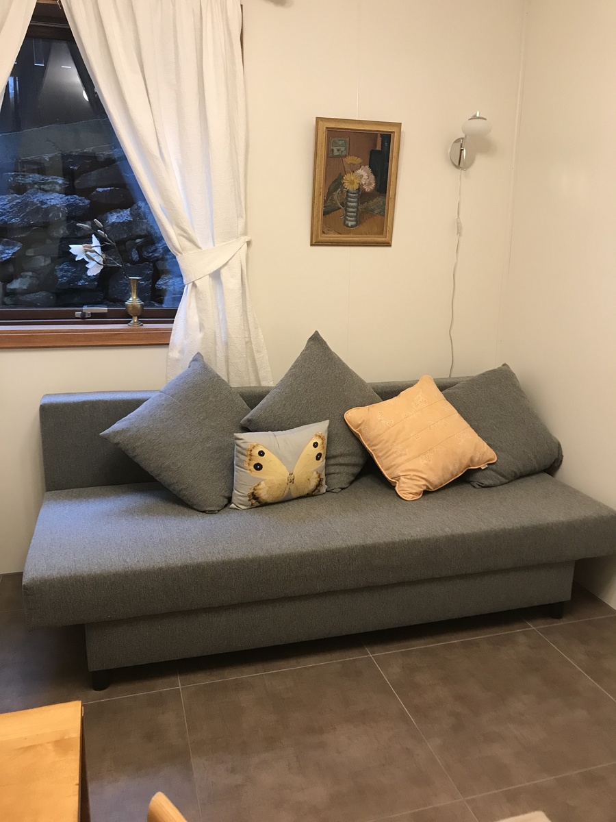 Norsk: Hei, leier ut vår ettromsleilighet med egen inngang for en person over 18 år. Passer student eller pendler. Den inkluderer en entre med garderobe, et bad med dusj, servant, do og vaskemaskin, ett oppholdsrom med mini-kjøkken med kokeplate, lite kjøleskap, air-fryer, bord, stol og sovesofa som kan gjøres om til en 120 cm seng. Leien inkluderer internet. Strøm betales utenom og avregnes etter faktisk forbruk, estimert til 400-500 kr/mnd om vinteren. Utleieregler er at dyr, røyking eller rusmidler ikke tillates, og det skal være orden og rolig adferd mellom kl 23.00 og 08.00.