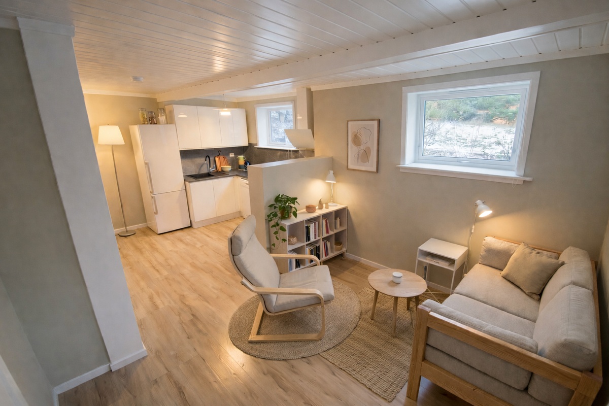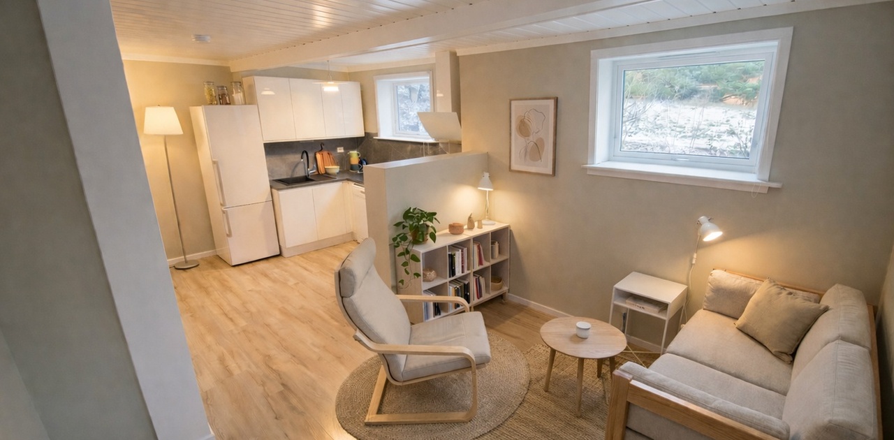 Planløsningen er godt utnyttet og har rom med varmekabler i gulvet og miniventilasjon som gir et godt og stabilt inneklima. I tillegg finnes en sovealkove som gir fleksible muligheter for seng eller kontor. Den åpne kjøkken- og stueløsningen oppleves lys og romslig, med store vindusflater og direkte utgang til en solrik og frodig hage.