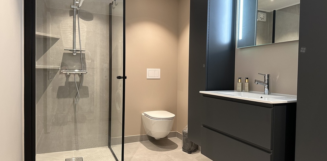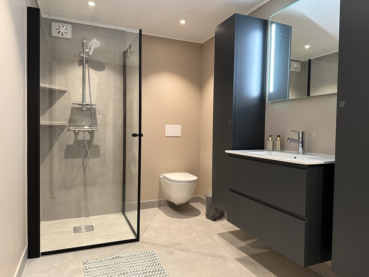 Stort åpent kjøkken og stue, moderne bad og to soverom med garderobeskap.