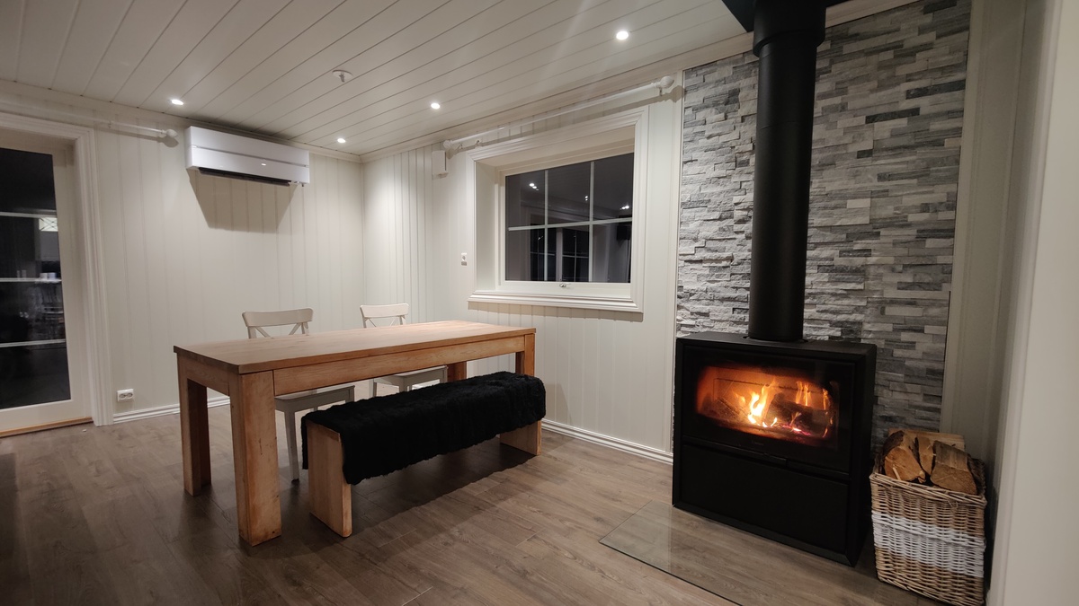 Også nymontert rentbrennende vedovn og Kaiteki 6600 varmepumpe.
